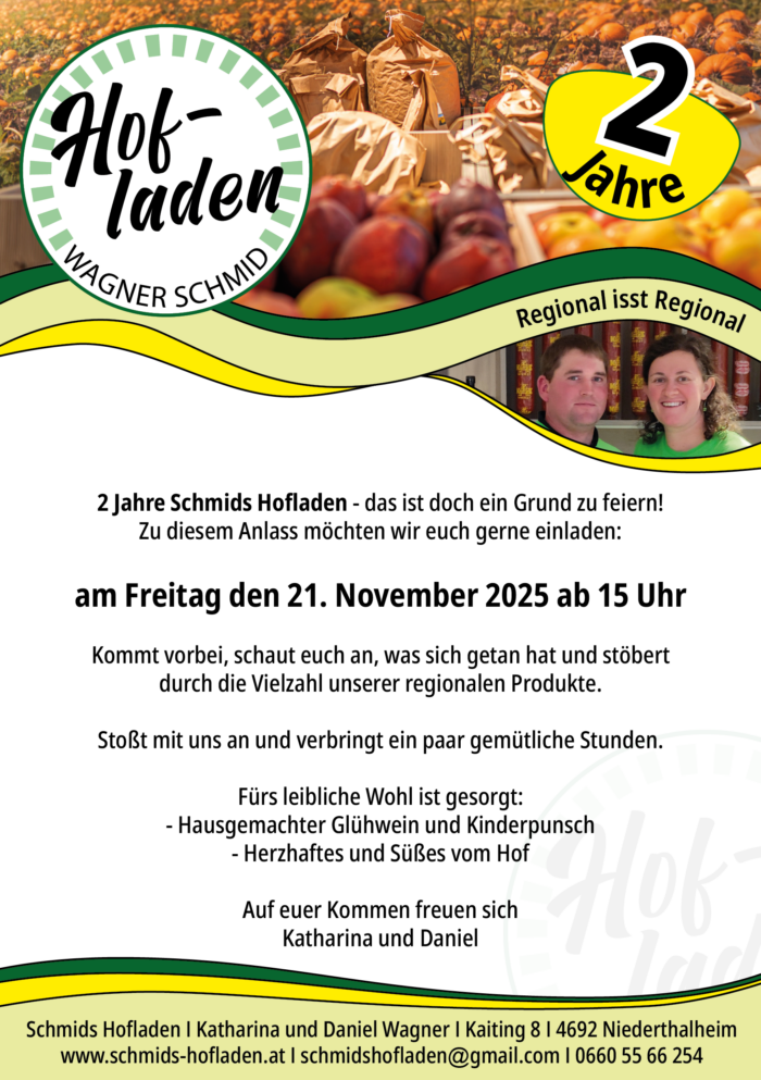 Tauchen Sie ein in unsere vielfältige Produktpalette und lernen Sie uns näher kennen. Bei Interesse stehen wir Ihnen gerne persönlich zur Verfügung, sei es per E-Mail oder Telefon. Ihre Kontaktaufnahme würde uns sehr freuen. Noch schöner wäre es natürlich, wenn Sie uns persönlich besuchen kommen könnten. Wir laden Sie herzlich dazu ein, unser Angebot vor Ort zu entdecken und die familiäre Atmosphäre unseres Hofladens zu erleben. Vielen Dank für Ihr Interesse – wir freuen uns darauf, von Ihnen zu hören oder Sie bei uns begrüßen zu dürfen!